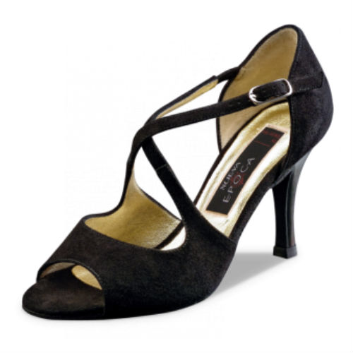 Elegant och mjuk sko i svart mocka läder. Fuktabsorberande läderfodring och 8 cm klack. Tryckknapps-funktion på slejfen. Skorna passar bra som t.ex. salsaskor, tangoskor, latindansskor eller som vanliga festskor/balskor.