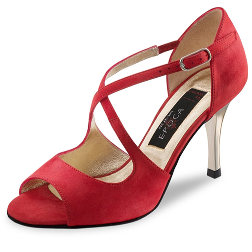 Rött mockaläder,ställbar rem med praktisk tryckknnapp.8 cm klack