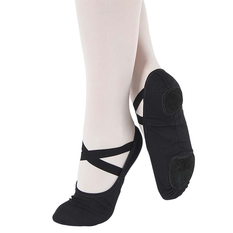 Mjuk balettsko/tekniksko i stretchtyg (canvas) med delad mockasula. Dubbla resårband färdigsydda i kors över foten. Stretchtyget gör att skon sitter väldigt fint på foten.